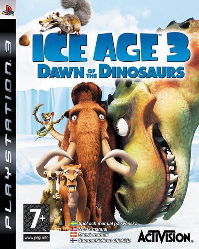《冰河世纪3:恐龙的黎明》(英文名:Ice Age3: Dawn of the Dinosaurs),是一款根据同名电影改编的游戏,由Eurocom Entertainment Software制作,Activision/10tacle Studios AG发行,2009年6月发售。《冰河世纪3:恐龙的黎明》游戏版的背景与电影版一样,经历了前两集的历险之后,长毛象曼弗瑞德、树懒希德、剑齿虎迪亚戈又遇到了新麻烦,不知道从哪里蹦出来的霸王龙掳走了希德。为了寻找同伴,一行动物走入了冰河世纪的“世外桃源”——那里温暖如侏罗纪,躲过了大灭绝的恐龙就生活在此。虽然恐龙世界十分危险,但几位竟然玩得不亦乐乎。